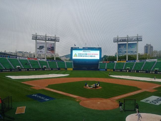 여전히 조금씩 비가 내렸지만, 내야에 방수포를 모두 덮어놓았던 만큼, 경기 시작에는 큰 무리가 없을 전망이다.