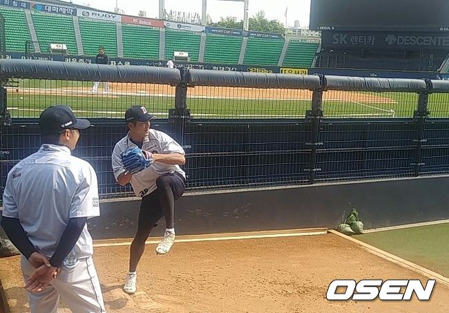 이날 경기를 앞두고 김원형 투수 코치는 훈련을 마치고 들어가는 김대한을 잠깐 불러세웠다. 김원형 코치는 “공을 던져보라”며 김대한을 불펜 마운드에 세웠고, 김대한은 잠시 몸을 푼 뒤 힘껏 공을 던졌다.