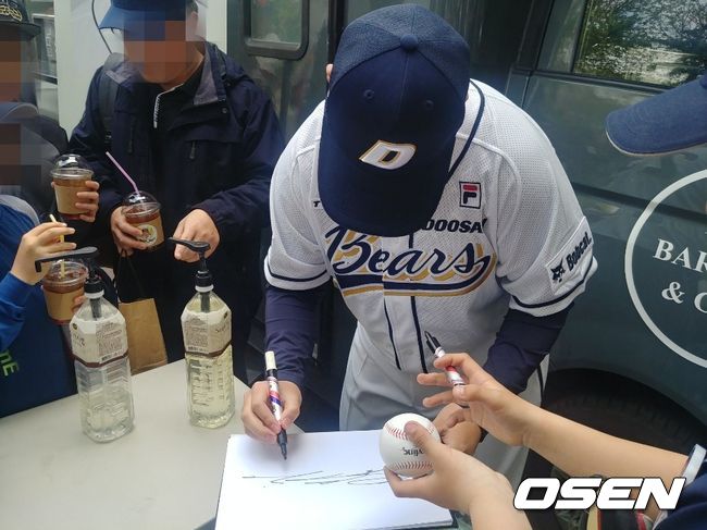 이날 팬 사인회가 예정돼 있던 유희관은 사인회에 앞서 커피차를 방문해 팬들에게 시럽을 따라주고, 빨대를 주는 등 '팬서비스'를 하기도 했다. 아울러 팬들의 사인 요청에도 밝게 웃으면서 한 명씩 사인을 해주기도 했다.