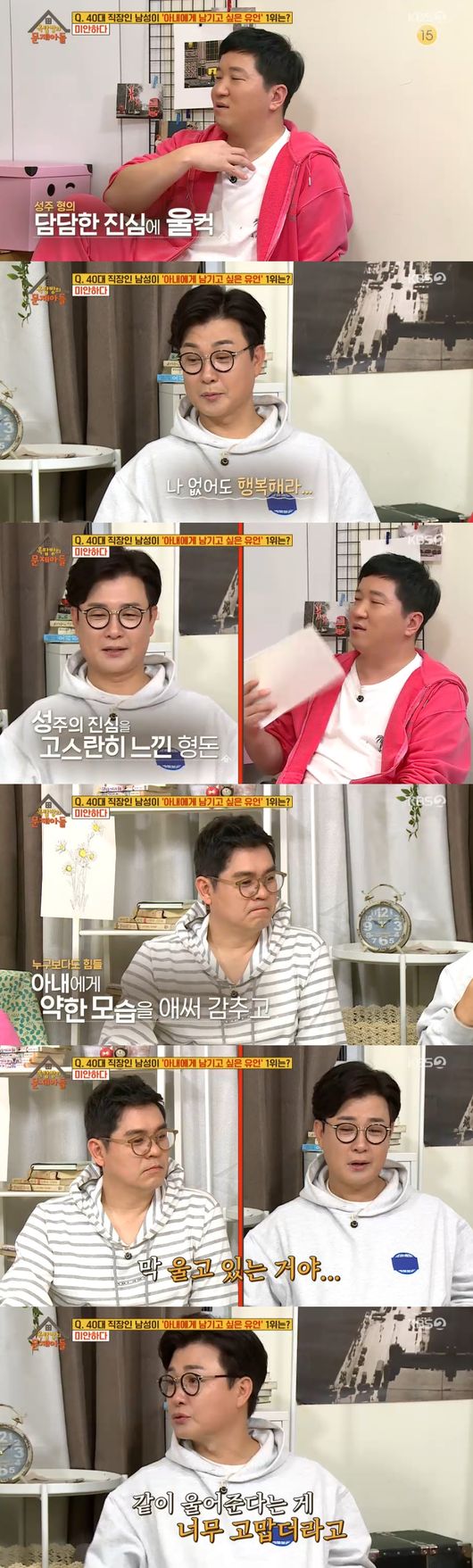 다음은 40대 직장인 남성이 아내에게 남기고 싶은 유언 1위를 맞혀야했다. 김성주는 "아이들과 부모님을 잘 부탁한다 아니냐"고 추측, 하지만 이는 3위라고 했다. 정형돈은 혼자 남을 아내를 위해 "좋은 남자 만나라 아니냐"고 추측, 김성주는 1위가 아닐 것 같다고 했고 역시 오답이었다. 김성주는 "울컥한다"면서 답을 말하기 전 먹먹해했다. 그러면서 "같이 살아줘서 고맙고 사랑한다"면서 감정이입, 하지만 2위와 4위였다. 이때 성주의 답을 주워먹어 정형돈이 '미안하다'를 외쳤고, 이는 정답이었다.