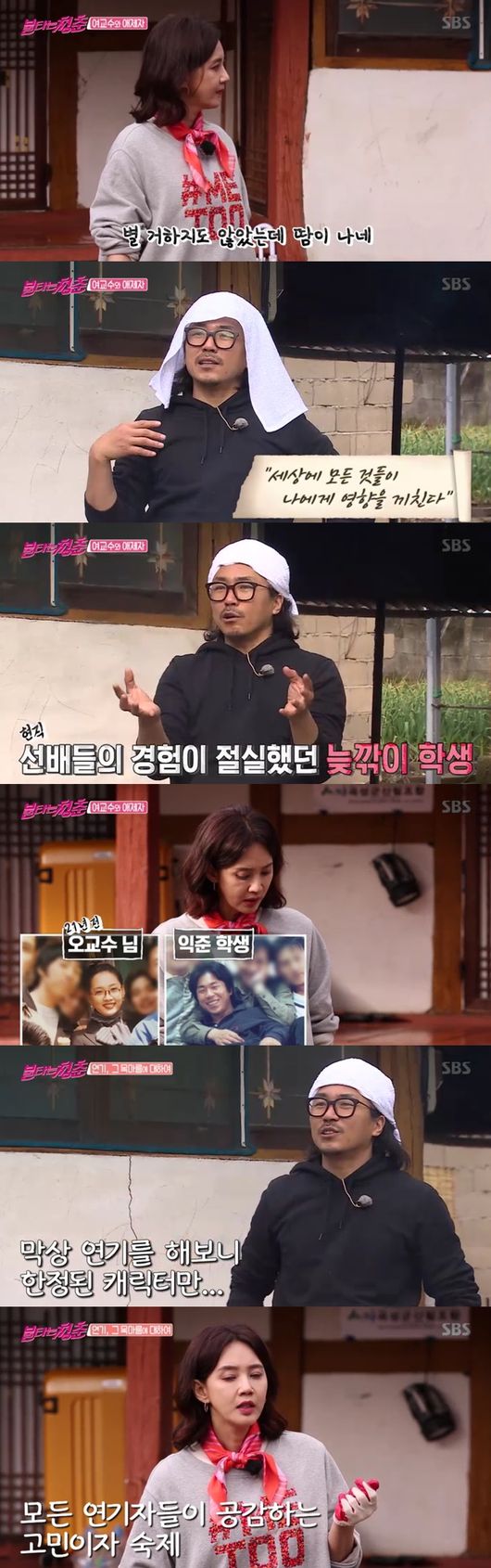 양익준이 땀샘을 폭발, 오현경이 그런 양익준을 걱정해 직접 수건을 둘러줬다. 양익준은 "마님!"이라고 장난쳤고, 오현경은 "나를 불렀느냐"라며 척하면 척 사제지간 사극 상황극으로 웃음을 안겼다.