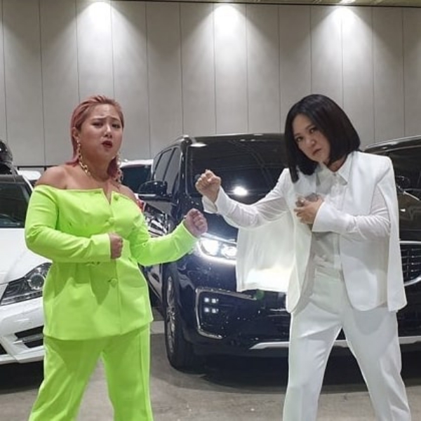 공개된 사진 속 박나래와 김숙은 주차장에서 결투 신을 찍는 듯한 포즈를 취해 웃음을 자아낸다. 험악한 표정을 짓고 있는 두 사람은 서로를 향해 주먹을 뻗고 있어, 영화의 한 장면을 연상케 한다. 특히 박나래는 네온 슈트로, 김숙은 화이트 슈트로 멋을 낸 모습으로 눈길을 끈다.