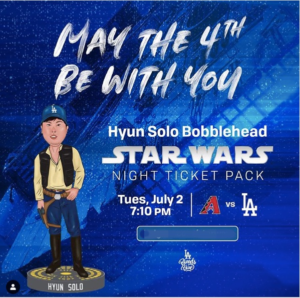 다저스 구단은 이날 구단 SNS을 통해 ‘한 솔로’로 변신한 류현진의 버블헤드 인형 ‘현 솔로’를 소개하면서 ‘스타워즈 데이’ 이벤트를 알렸다. 다저스는 오는 7월 3일 애리조나와의 홈 경기에 스페셜 티켓을 구매하는 팬들에게 류현진 버블헤드 인형을 선물로 나눠줄 계획이다.