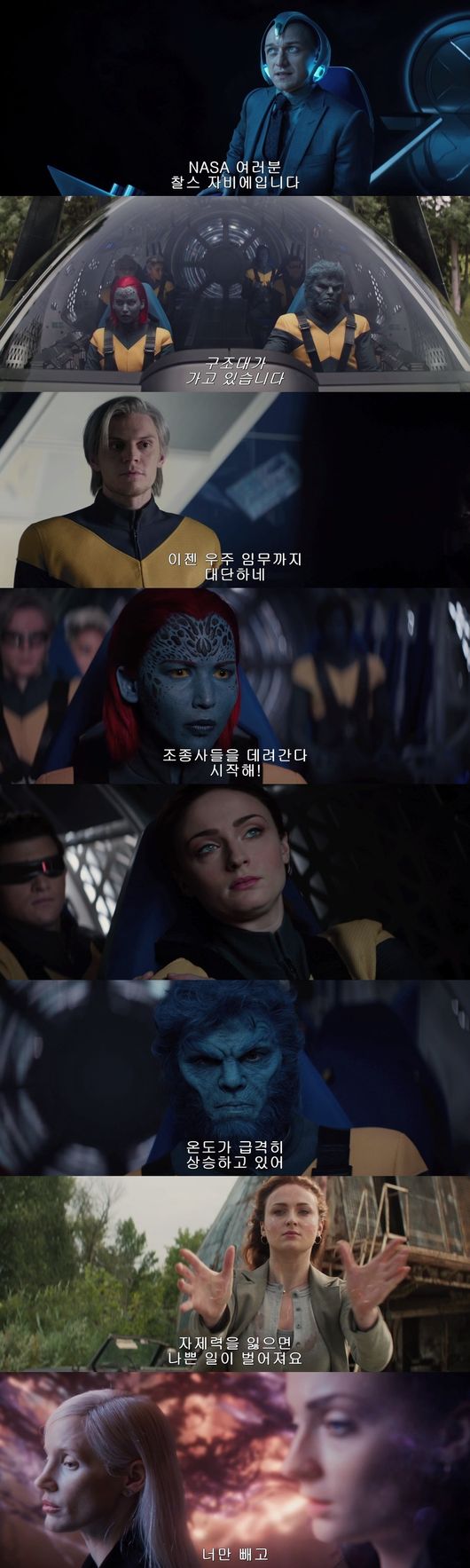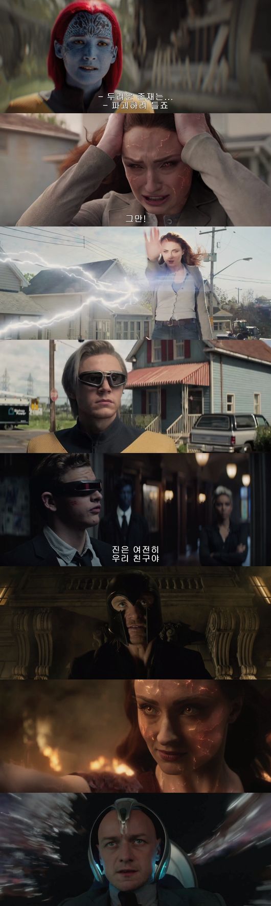 여기에 가장 강력하고 파괴적인 적 다크 피닉스로 변한 진 그레이를 두고 “진은 여전히 우리 친구야”라고 말하는 사이클롭스(타이 쉐리던)와 “예전의 진이 아니에요”라고 말하는 비스트(니콜라스 홀트)의 대립은 사랑하는 친구에서 최악의 적으로 변한 진 그레이와 맞서 싸워야 하는 엑스맨들의 딜레마를 보여주며 강렬한 드라마를 예고한다.