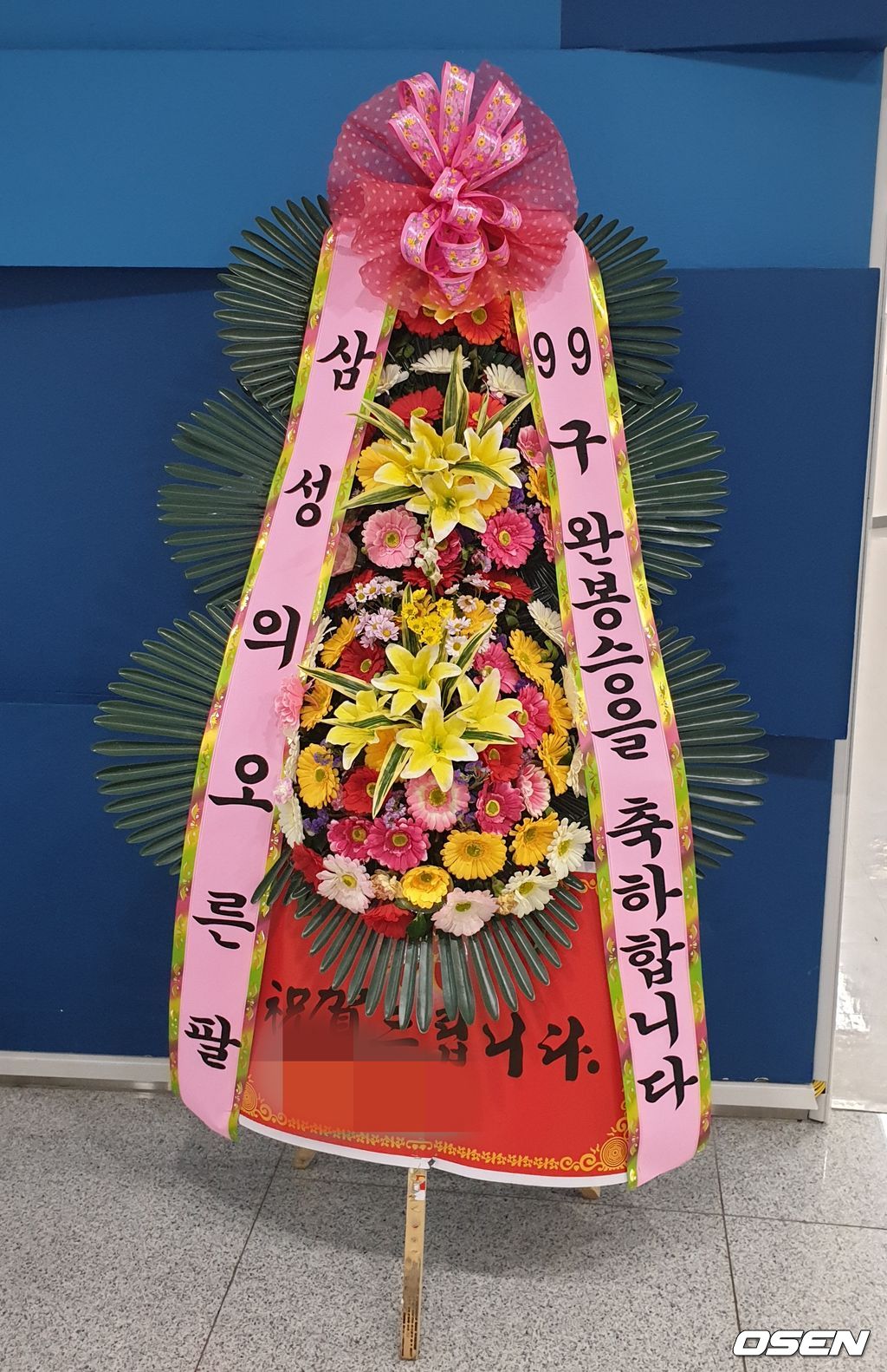 안내 데스크 옆에 윤성환(삼성)의 시즌 첫 완봉승을 축하하는 대형 화환이 놓여져 있었다. 화환에는 ‘99구 완봉승을 축하합니다. 삼성의 오른팔'이라는 문구가 적혀 있었다.