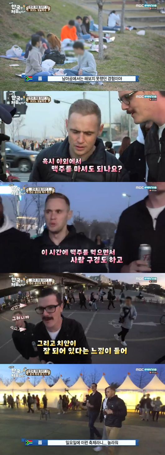 무엇보다 밖에서 술 마시는 야외음주가 불법이라는 남아공과 달리, 한강에서 맥주 한 잔을 마시게 된 친구들은 "이 시간에 맥주를 마시고 사람들을 구경하다니, 게다가 일요일에 축제라니"라면서 저녁 늦게에도 사람들이 많은 풍경에 놀라워했다. 이어 다양한 볼거리와 먹거리가 가득한 행사장에서 본격 축제를 즐겼다.