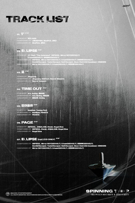 이에 JYP는 14일 0시 GOT7의 각종 SNS 채널에 새 앨범 'SPINNING TOP'의 트랙리스트가 담긴 이미지를 공개하고 타이틀곡 및 수록곡들에 대한 정보를 알렸다.