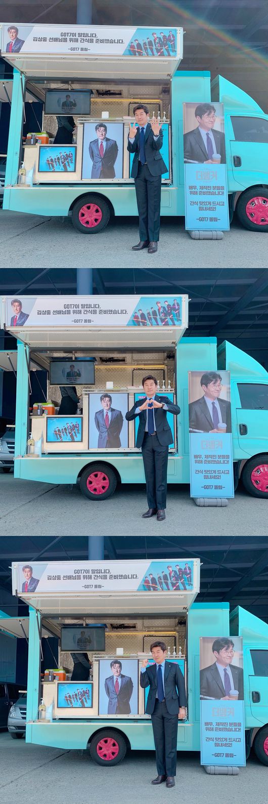 최근 GOT7은 배우 김상중이 노대호 역을 맡아 주연으로서 활약하고 있는 MBC 수목드라마 '더 뱅커' 촬영장에 간식차를 선물했다.