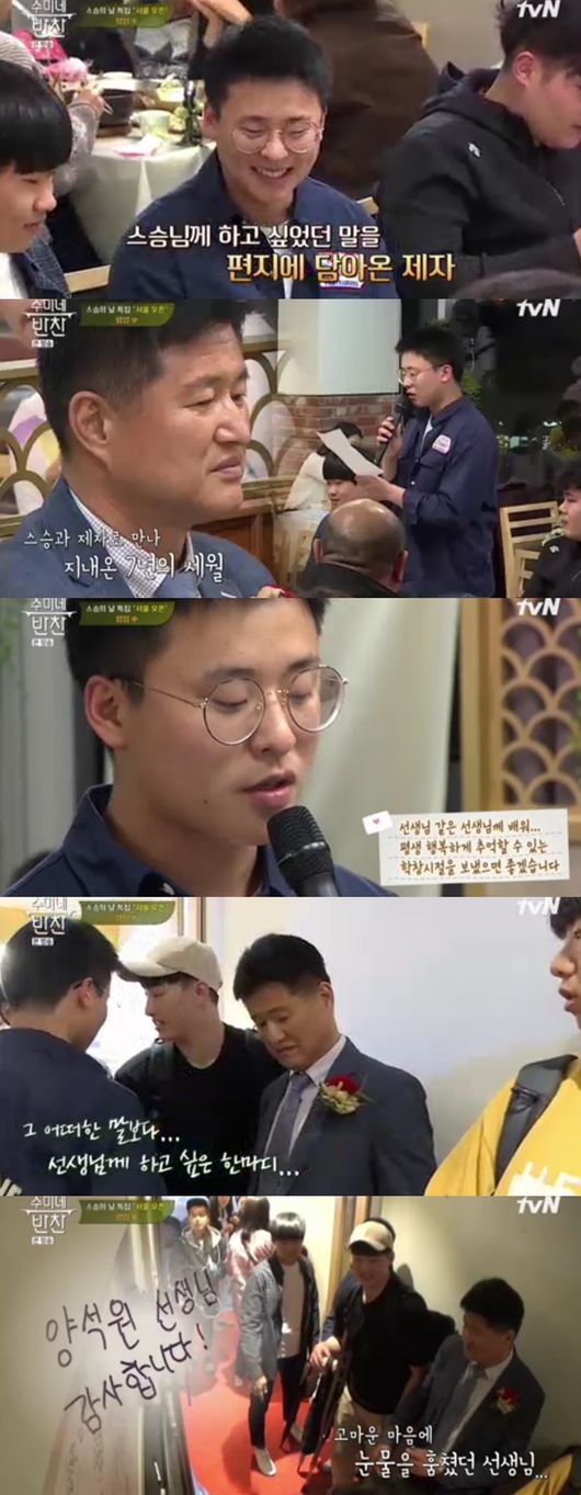 점점 빈그릇이 쌓여갈 때쯤, 김동민은 감동의 사연을 전했다. 군입대를 앞둔한 제자가 정년퇴임을 앞둔 선생님에게 전하는 손편지였다. 제자는 "나의 자녀도 선생님 같은 선생님에게 배우길 바란다, 가르침 덕분에 깊이 있는 어른이 되어가고 있다"면서 스승과 제자로 만난 세월을 가슴 속에 남기며 다시 한번 따뜻한 스승님의 감사함을 느꼈다. 평소 말하지 못했던 고마운 마음을 전하는 뜻깊은 시간이었다.