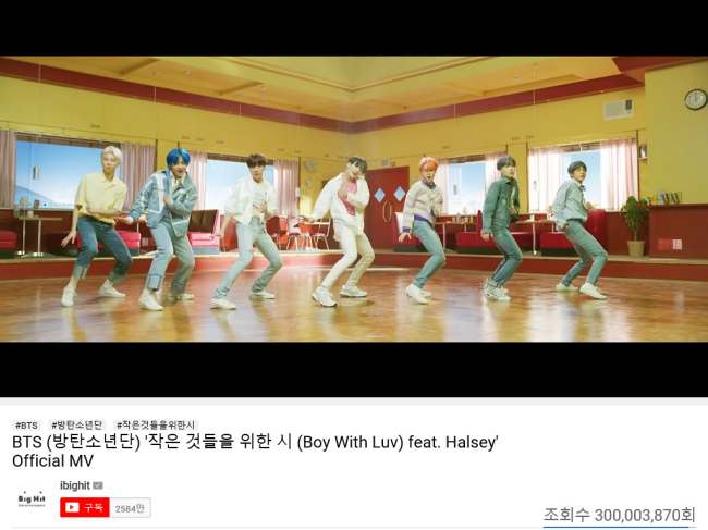 뿐만 아니라 방탄소년단은 이날 오후 12시 47분 기준, ‘작은 것들을 위한 시’ 뮤직비디오 3억뷰 돌파를 달성하며 또 하나의 기록을 세우기도 했다. 통산 10번째 3억뷰 뮤직비디오로, 한국 가수 최다 기록을 자체 경신한 것.