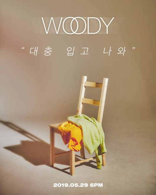 공개된 티저 이미지에 따르면 우디가 4개월 만에 발표하는 신곡 타이틀은 ‘대충 입고 나와’로, 의자 위에 아무렇게나 쌓아놓은 옷가지들이 타이틀의 의미를 설명한다.