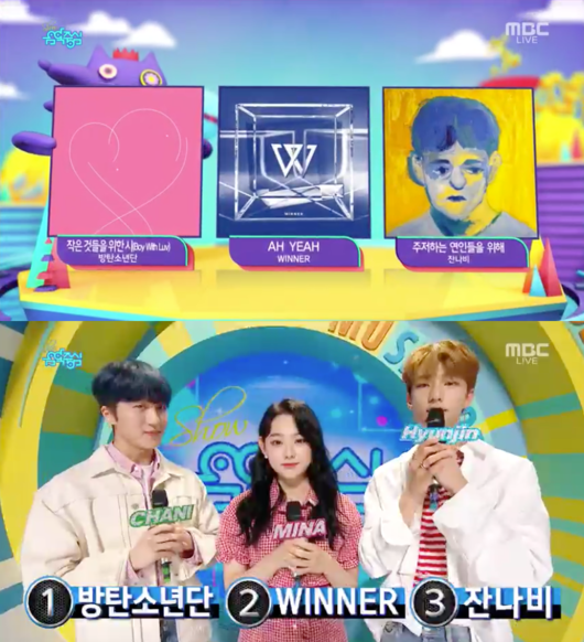 25일 방송된 MBC ‘쇼! 음악중심’에서 5월 마지막 주 1위 후보가 공개됐다. ‘작은 것들을 위한 시’의 방탄소년단, ‘아예’의 위너, ‘주저하는 연인들을 위해’의 잔나비가 주인공.