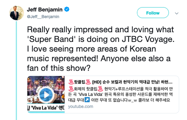 제프 벤자민은 방탄소년단, 갓세븐, 몬스타엑스 등 국내외를 오가며 활동하고 있는 K팝 아이돌 위주의 음악 리뷰를 작성하는 것으로 잘 알려졌다. 그런 그가 '슈퍼밴드'이란 프로그램과 방송 중 무대에 대한 감상평을 남겼다는 점은 주목할 만하다.