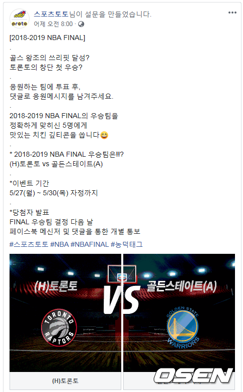 체육진흥투표권 스포츠토토의 수탁사업자인 ㈜케이토토(www.ktoto.co.kr)가 공식 페이스북(www.facebook.com/sportstoto.toto.proto)을 통해 미국프로농구(NBA) 파이널 토론토-골든스테이트전을 대상으로 우승팀을 맞히는 이벤트를 진행한다.