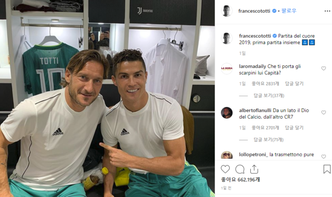 로마의 디렉터로 일하고 있는 토티는 경기 시작 전 자신의 SNS에 호날두와 함께 찍은 셀카를 올리며 '함께 뛰는 첫 시합'이라고 팬들을 설레게 했다.