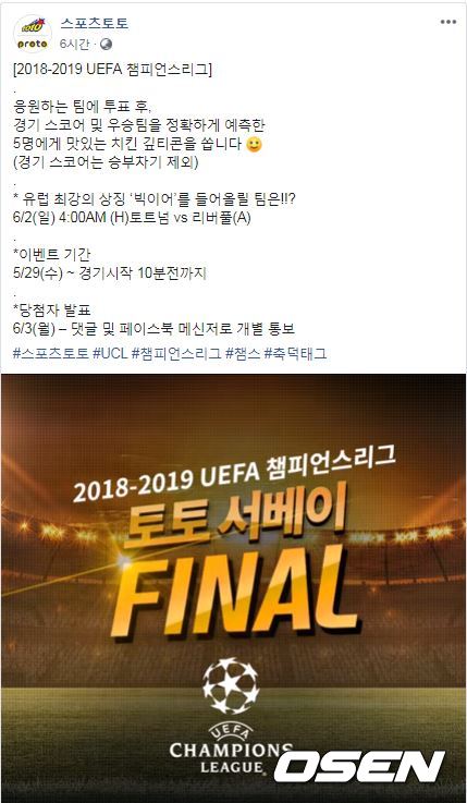 체육진흥투표권 스포츠토토의 수탁사업자인 ㈜케이토토(www.ktoto.co.kr)가 공식 페이스북(www.facebook.com/sportstoto.toto.proto)을 통해 2018-2019 UEFA챔피언스리그(이하 UCL) 결승전 토트넘(홈)-리버풀(원정)전을 대상으로 경기 스코어 및 우승팀을 맞히는 이벤트를 진행한다.