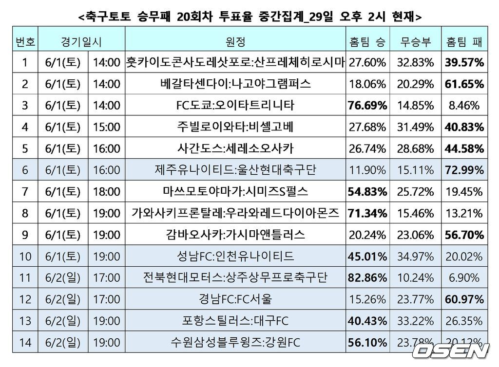 체육진흥투표권 스포츠토토의 수탁사업자인 케이토토(www.ktoto.co.kr)가 오는 6월 1일(토)부터 2일(일)까지 벌어지는 일본프로축구(J리그) 8경기와 국내프로축구(K리그) 6경기 등 총 14경기를 대상으로 한 축구토토 승무패 20회차 제주-울산(6경기)전에서 국내 축구팬들의 72.99%가 원정 경기를 치르는 울산의 승리를 예상했다고 밝혔다. 이어 양팀의 무승부 예측은 15.11%로 나타났고, 홈팀 제주의 승리는 11.90%를 기록했다.