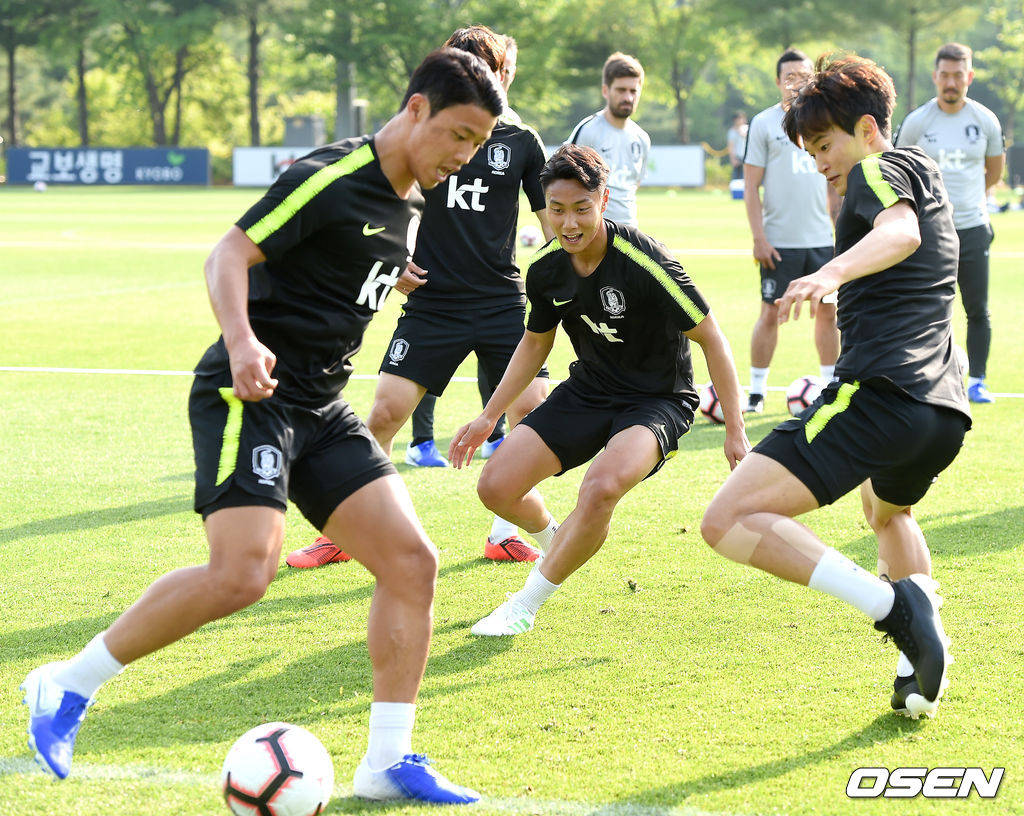 황의조, 황희찬, 백승호, 이재성, 김진수 등을 비롯한 선수들이 패스게임을 하고 있다.