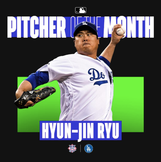 5월 한 달 동안 6경기에 나온 류현진은 5승 무패 평균자책점 0.59의 성적을 거뒀다. 월간 최다 승리와 함께 월간 투구 이닝(45⅔이닝), 평균자책점 모두 1위에 올랐다. 류현진은 박찬호(1998년) 이후 한국인으로서는 두 번째 이 달의 투수상 주인공이 됐다.
