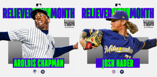 이 달의 불펜 투수로는 내셔널리그 조쉬 헤이더(밀워키)와 아메리칸리그 아롤디스 채프먼(양키스)가 뽑혔다. 헤이더는 10경기 등판해 1승 1패 6세이브 평균자책점 0.71을 기록했고, 채프먼은 12경기 11세이브 평균자책점 0.79로 뒷문 단속을 확실하게 했다. / bellstop@osen.co.kr