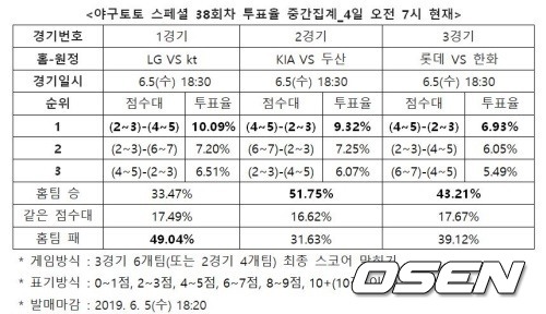 체육진흥투표권 스포츠토토의 수탁사업자인 ㈜케이토토는 5일(수)에 열리는 2019시즌 한국프로야구(KBO)프로야구 3경기를 대상으로 한 야구토토 스페셜 38회차 투표율을 중간 집계한 결과, 참가자의 51.75%가 KIA-두산(2경기)전에서 안방경기를 치르는 KIA의 우세를 전망했다고 밝혔다.