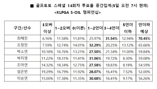 2번 선수 조정민은 65.66%로 그 뒤를 이었고, 박소연(59.84%), 박지영(59.08%), 이승연(56.26%), 조아연(54.59%) 그리고 임은빈(52.00%)까지 모든 선수가 과반수 언더파 투표율을 넘은 것으로 집계됐다.