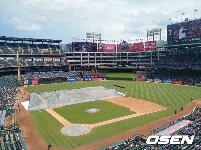 텍사스와 오클랜드는 10일(이하 한국시간) 미국 텍사스주 알링턴의 글로브라이프파크에서 ‘2019 메이저리그(MLB)’ 맞대결을 펼칠 예정이었다. 그러나경기 개시를 약 한 시간 전을 앞두고 글로브라이프파크에는 많은 비가 내렸고, 그라운드에는 방수포가 깔렸다.