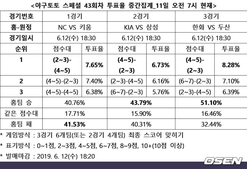 이번 야구토토 스페셜 43회차 게임은 경기 시작 10분 전인 오는 12일 오후 6시 20분 발매가 마감되며, 경기가 모두 종료된 후에 적중결과가 공식 발표된다.