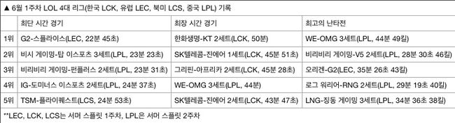 반면 LPL은 난타전 ‘탑5’에 4경기를 등재하며 6월 1주차 최고의 싸움꾼 리그가 됐다. OMG와 WE의 3세트는 장기전 4위를 기록한 만큼 긴 경기에서 수많은 죽음이 나왔다. 특히 지난 5일 벌어진 2019 LPL 서머 스플릿 비리비리 게이밍과 V5의 2세트는 28분 만에 무려 46킬(2위)이 나와 팬들이 눈을 못 떼게 만들었다.