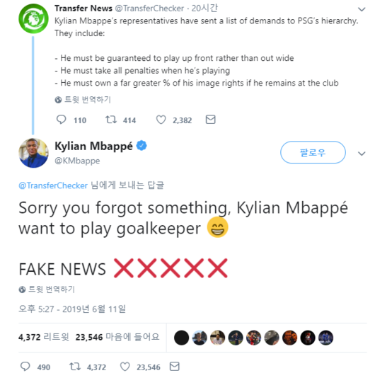 글로벌 '폭스 스포츠 아시아'는 12일(한국시간) "음바페가 자신을 둘러싼 루머성 기사를 유쾌하게 반박했다"고 보도했다.