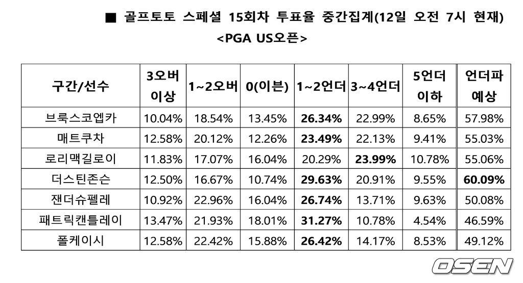 지정 선수별 1라운드 예상 스코어에서는 로리 맥길로이(23.99%)만이 3~4언더파 항목에서 1순위를 기록했고, 나머지 선수들은 모두 1~2언더파에서 가장 높은 투표율을 보였다.