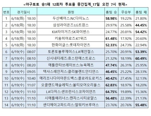 국내외 프로야구 14경기 대상 야구토토 승1패 12회차 투표율 중간집계 결과