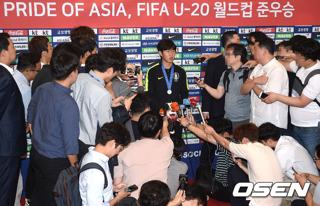 정정용 감독이 이끄는 20세 이하(U-20) 대표팀은 17일 오전 인천공항을 통해 금의환향했다. 비록 우크라이나에 역전패했지만 국제축구연맹(FIFA) 주관 남자 축구 사상 첫 결승전을 치렀고 준우승까지 차지해 언론과 국민들의 관심은 대단했다.