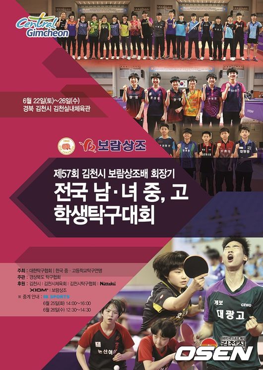 한국중고등학교탁구연맹(회장 손범규)이 주최하는 대회 중 최대 규모를 자랑하는 이번 대회는 대한탁구협회(회장 유승민)와 한국중고등학교탁구연맹이 공동 주최하며 김천시탁구협회가 주관한다. 단체전과 개인단식, 개인복식의 3개 종목으로 진행되는 이번 대회는 68개교 417명의 선수를 비롯한 천여명의 선수단이 참가해 실력을 발휘할 예정이다. TV중계는25, 26일 양일간 아이비스포츠(IB SPORTS)를 통해 생중계되며 보람상조 남자실업 탁구팀 ‘보람할렐루야 탁구단’ 오광헌 감독이 메인 해설자로 나선다.