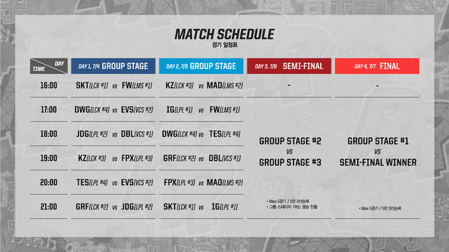 4, 5일 양일간 오후 4시부터 진행되는 그룹 스테이지는 각 리그 별 같은 순위를 기록한 팀끼리 한번씩 단판으로 맞붙으며, 하루에 6경기씩 이틀간 총 12경기가 펼쳐진다. 개막전은 지난 ‘미드 시즌 인비테이셔널(이하 MSI)’ 4강전에서 아쉽게 탈락의 고배를 마셨던 LCK의 ‘SK텔레콤 T1’과 LMS의 맹주 ‘플래시 울브즈’ 간의 대결로 펼쳐진다. 그룹 스테이지 진행 후 가장 많은 승리를 가져간 1위 지역은 7일 열리는 결승에 진출하게 되며, 나머지 2개 지역은 6일 준결승전에 진출한다.