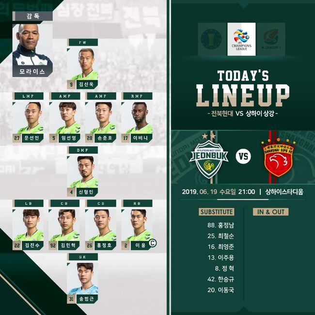 전북 현대는 19일 중국 상하이 상하이스타디움에서 열릴 2019 아시아축구연맹(AFC) 챔피언스리그 16강 1차전 상하이와 경기에 나설 선발 명단을 발표했다.