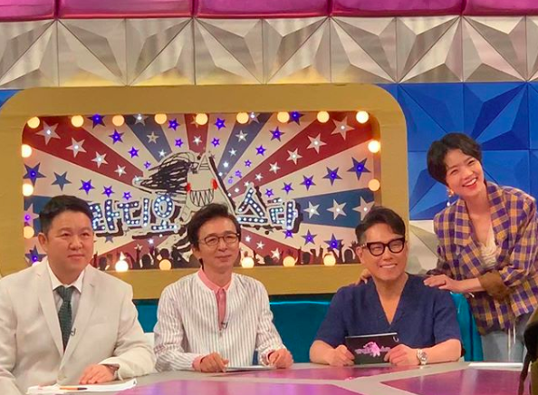 사진 속에서 MBC ‘황금어장-라디오스타’ MC 김국진, 윤종신, 김구라가 새 MC 안영미와 단체 사진을 찍고 있는 모습이다.