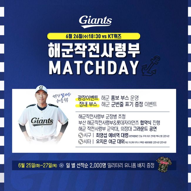 롯데 자이언츠는 26일 열리는 KT와의 홈경기에서 해군작전사령부 매치데이를 진행하고 해군 하정복을 모티브로 제작한 밀리터리 유니폼을 착용하고 경기에 나선다.