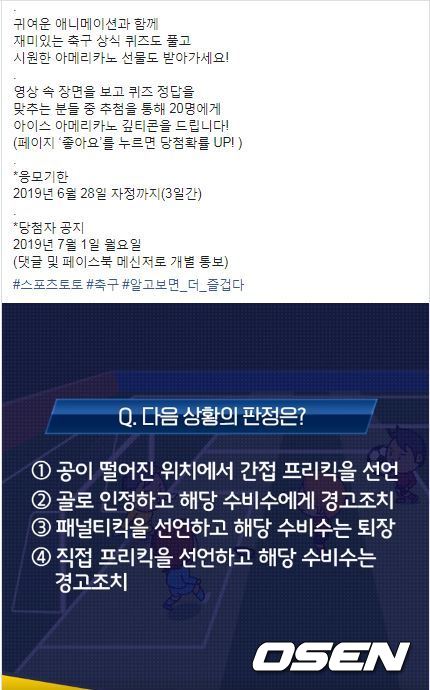 보기로는, 1번 공이 떨어진 위치에서 간접 프리킥을 선언, 2번 골로 인정하고 해당 수비수에게 경고조치, 3번 패널티킥을 선언하고 해당 수비수는 퇴장, 4번 직접 프리킥을 선언하고 해당 수비수는 경고조치 등 4개의 항목이 주어지며, 영상의 상황에 맞는 판정이라고 생각하는 답안을 이벤트 페이지에 댓글로 달면 참여가 완료된다.