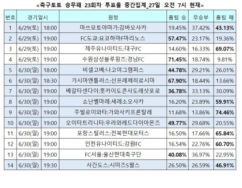 K리그 및 J리그 14경기 대상 축구토토 승무패 23회차 투표율 중간집계 결과
