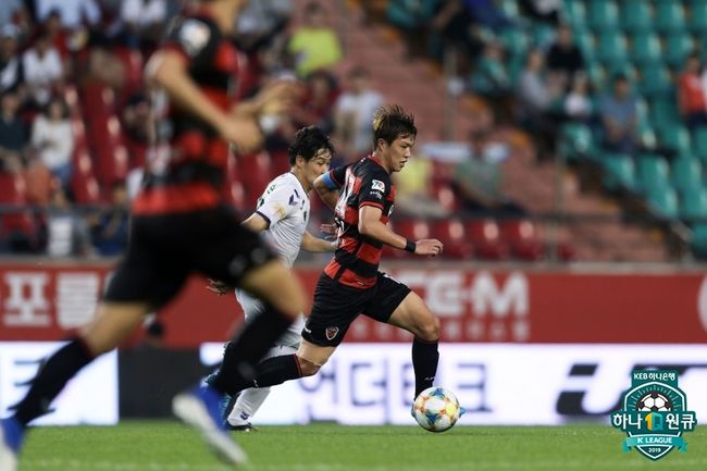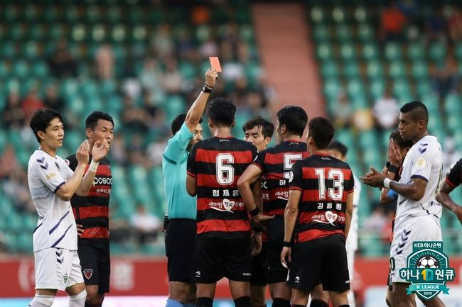 포항 입장에서 치명적인 악재가 터졌다. 전반 27분 하창래가 정혁을 향한 무리한 태클로 옐로 카드를 받았다. 앞서 옐로 카드를 받았던 그는 경고 누적으로 인해 퇴장을 당했다. 포항은 이른 시간부터 수적 열세를 안은 채 싸우게 됐다.