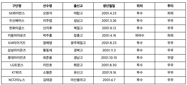 2020년 KBO리그 신인 1차 지명 10명의 주인공이 공개됐다.