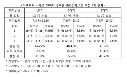 KBO 3경기 대상 야구토토 스페셜 59회차 투표율 중간집계