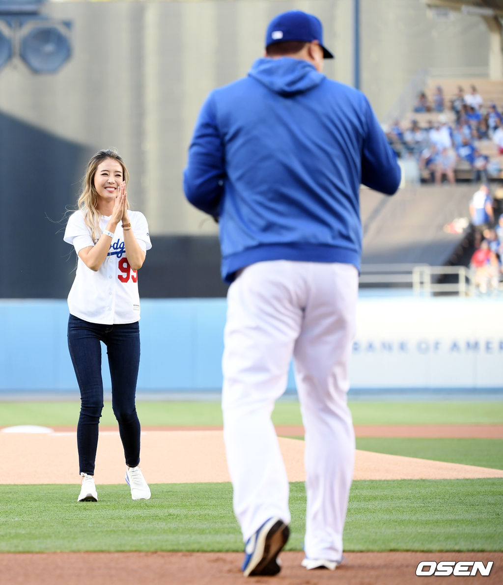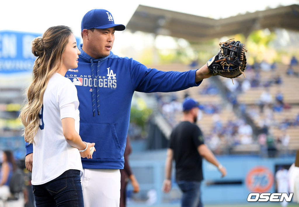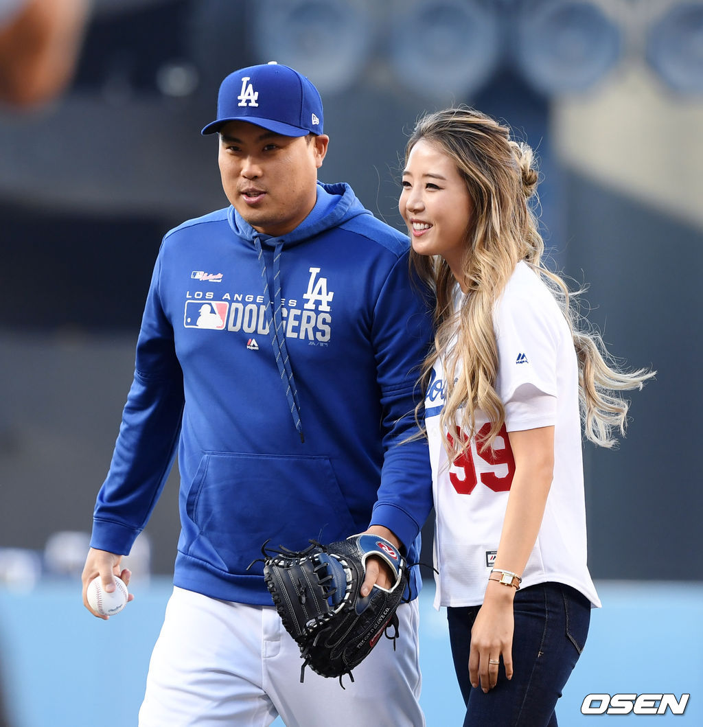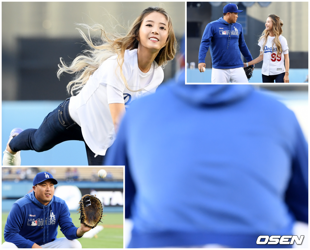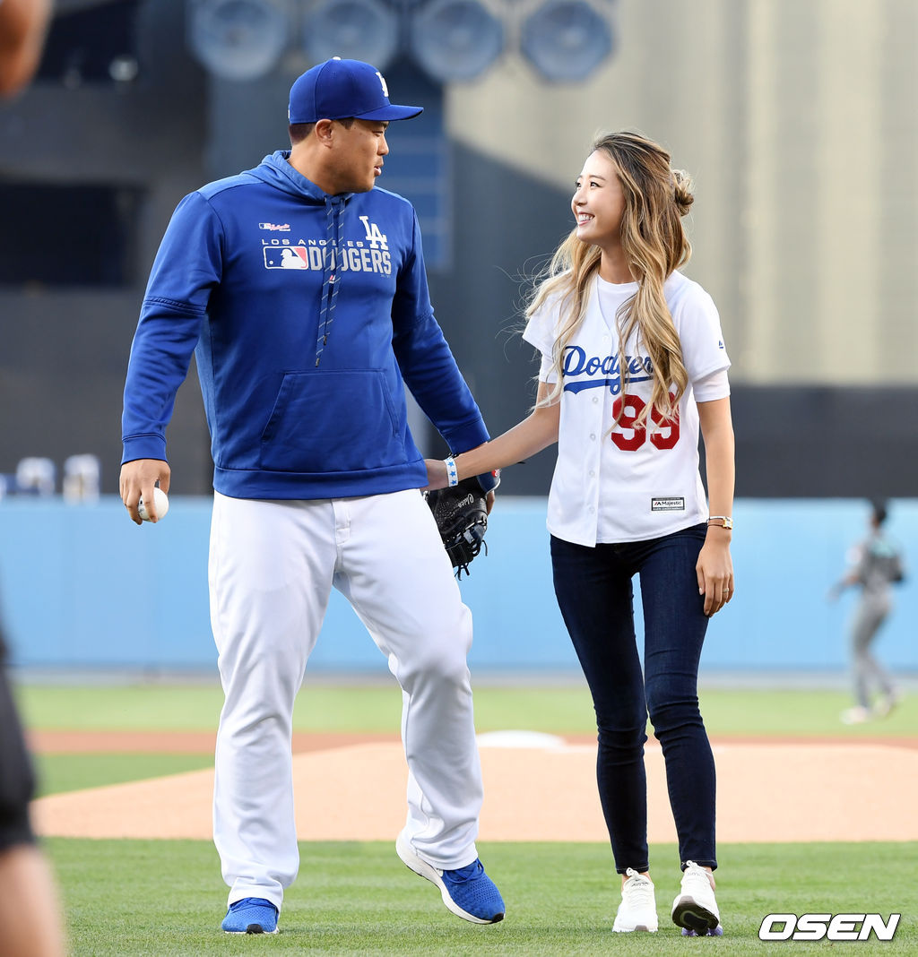 배지현은 3일 (한국시간) 미국 캘리포니아주 로스앤젤레스 다저 스타디움에서 열린 2019 메이저리그 LA 다저스와 애리조나 다이아몬드백스의 경기에 앞서 시구를 했다. 특히 남편 류현진이 시포를 해 눈길을 끌었다.