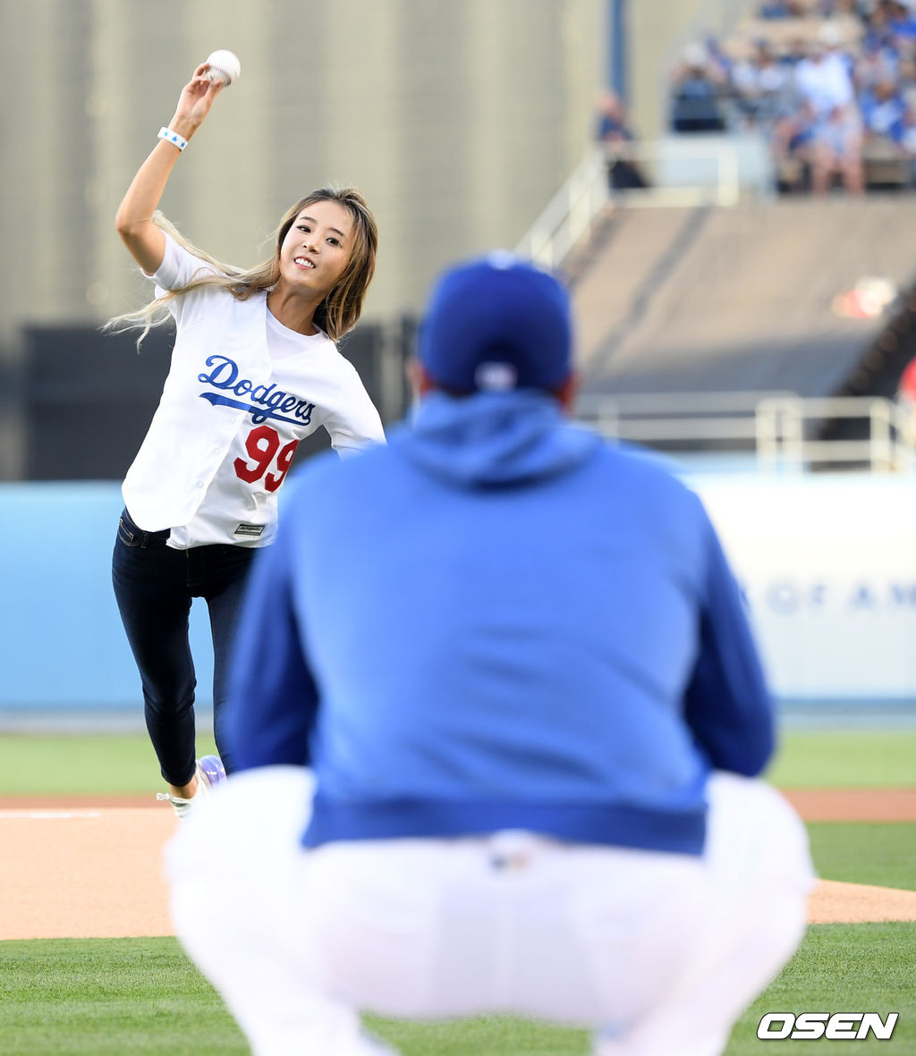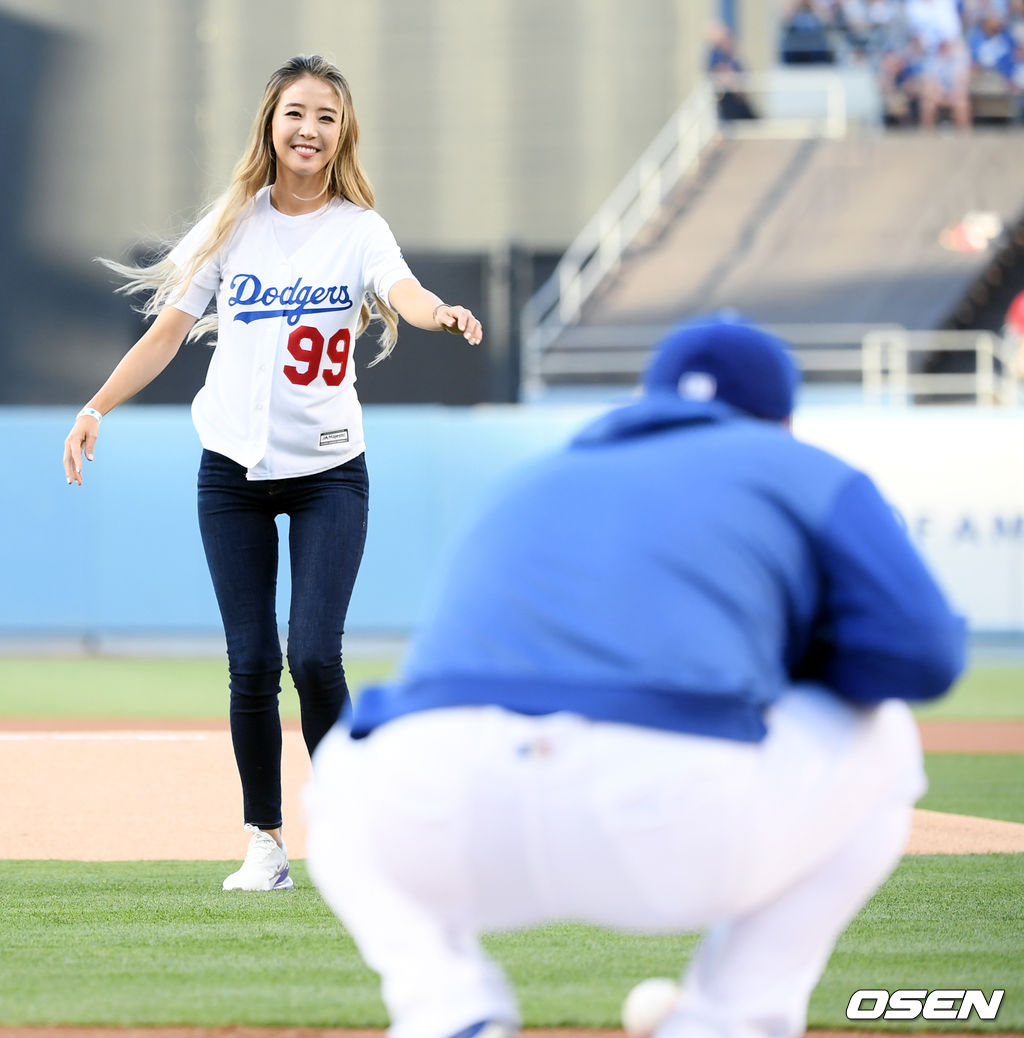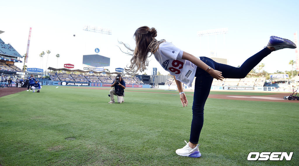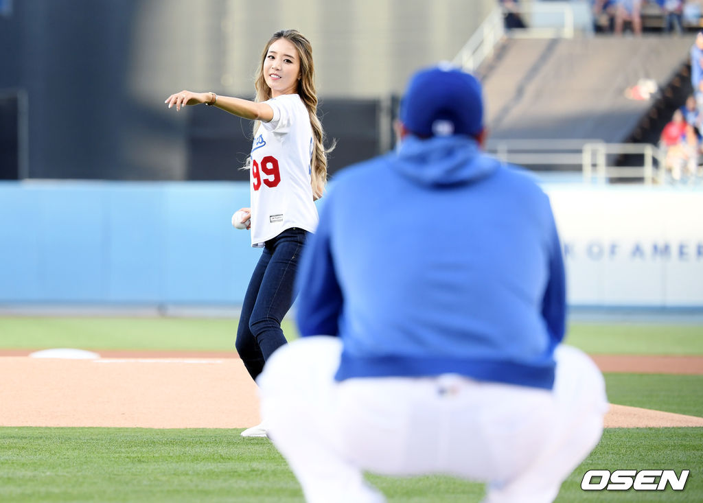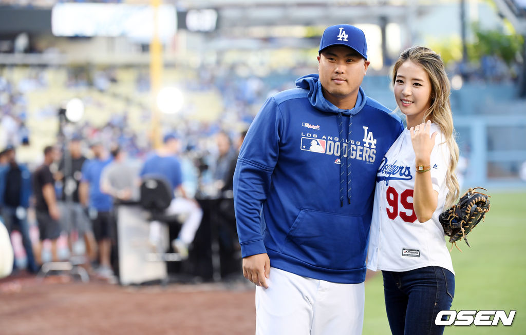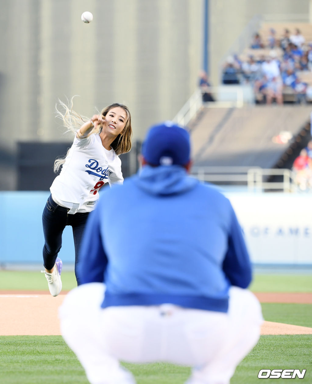배지현은 3일 (한국시간) 미국 캘리포니아주 로스앤젤레스 다저 스타디움에서 열린 2019 메이저리그 LA 다저스와 애리조나 다이아몬드백스의 경기에 앞서 시구를 했다. 특히 남편 류현진이 시포를 해 눈길을 끌었다.