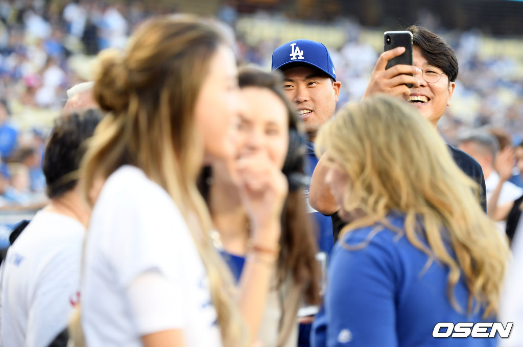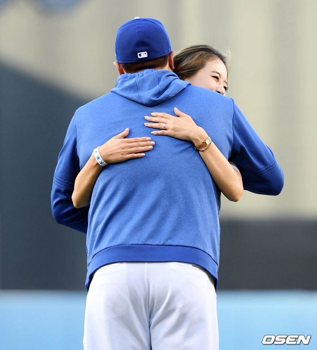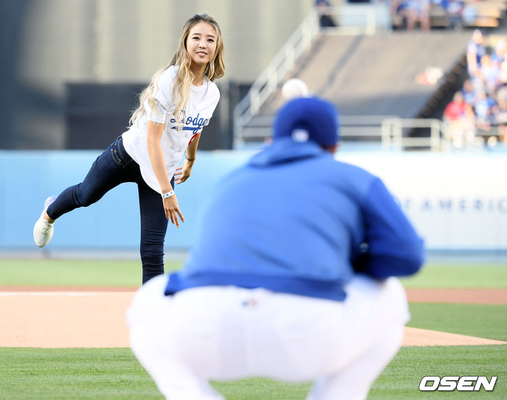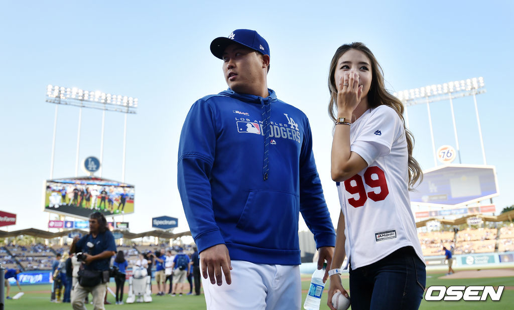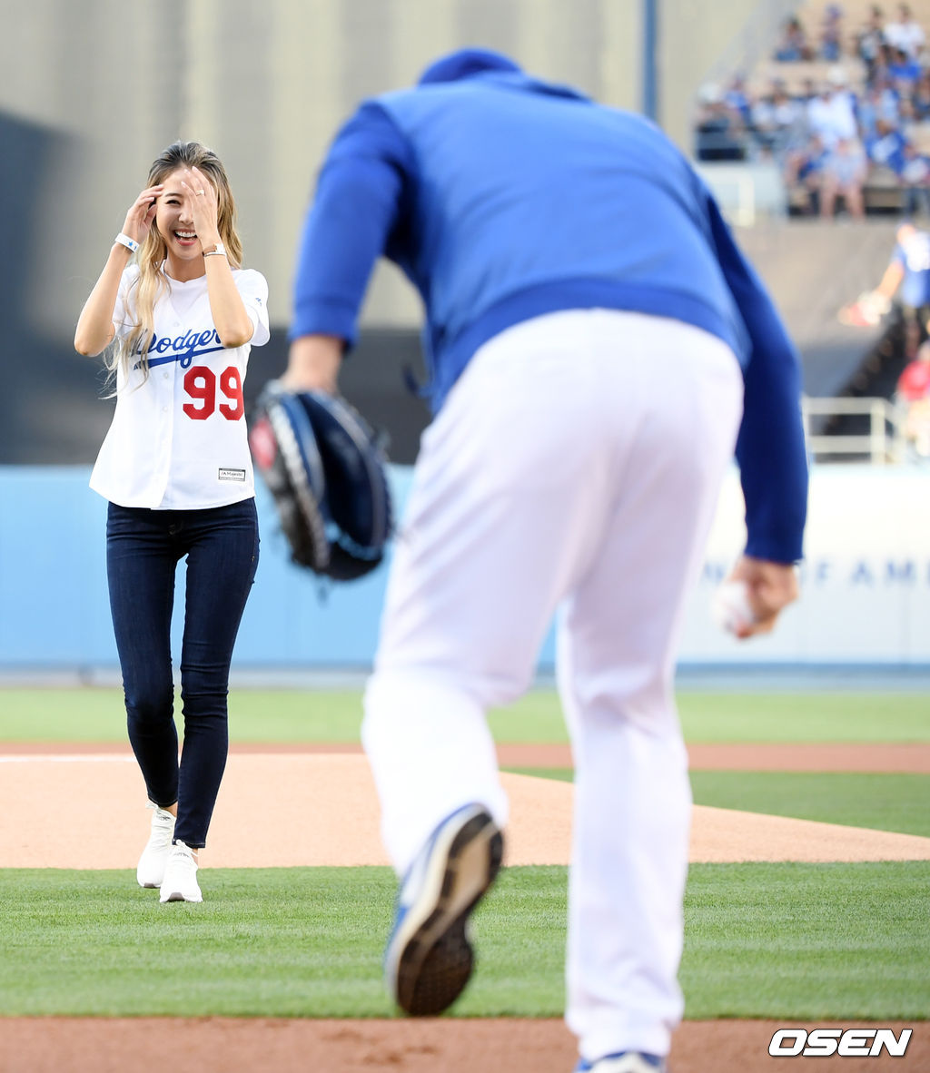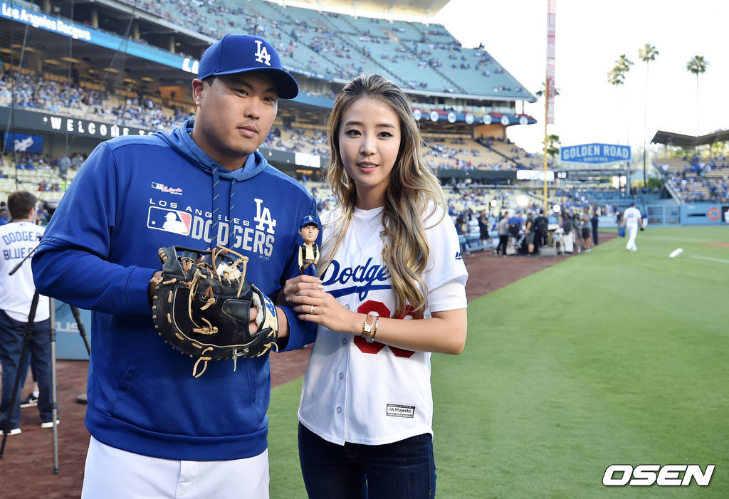 배지현은 3일 (한국시간) 미국 캘리포니아주 로스앤젤레스 다저 스타디움에서 열린 2019 메이저리그 LA 다저스와 애리조나 다이아몬드백스의 경기에 앞서 시구를 했다. 특히 남편 류현진이 시포를 해 눈길을 끌었다.