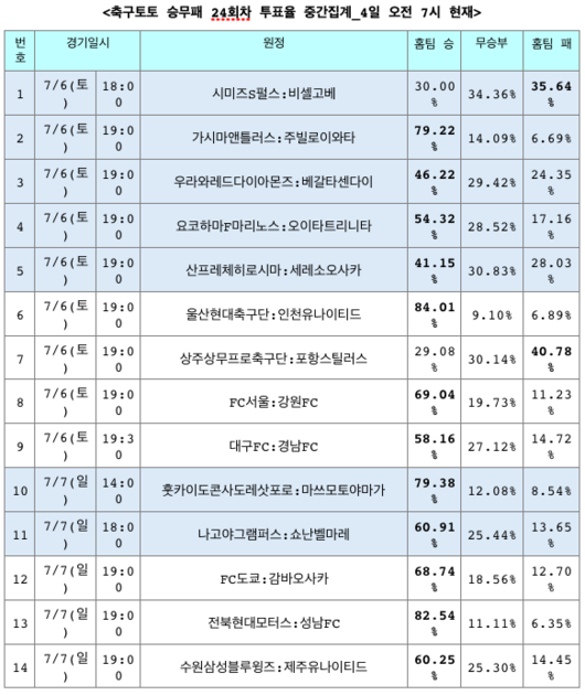 한편, 이번 승무패 24회차는 오는 7월 6일(토) 오후 5시 50분에 발매를 마감하며, 경기가 모두 종료된 후에 결과가 공식 발표된다.