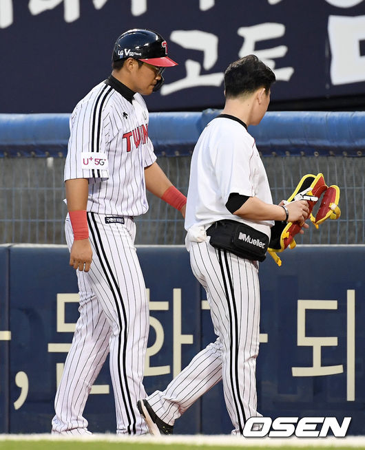 4회말 1사 주자없는 상황 LG 채은성이 내야 땅볼을 치고 상대 실책을 틈타 1루에서 세이프 됐다. 이후 발목에 불편함을 느껴 교체되는 채은성. /dreamer@osen.co.kr