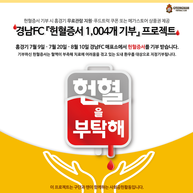 경남FC(이하 경남)가 ‘헌혈을 부탁해!’ 프로젝트를 실시한다.