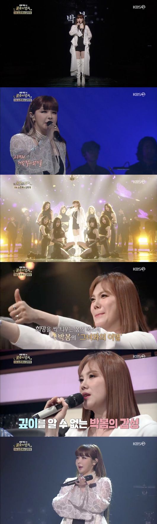 두 번째로 무대에 오른 박봄은 "9년만에 컴백을 했다. 불후의 명곡 무대에 처음 서게 됐는데 너무 긴장이 된다. 떨리지만 열심히 하겠다"고 소감을 밝힌 후 특유의 음색과 가창력을 뽐내며 관객들을 사로잡았다.